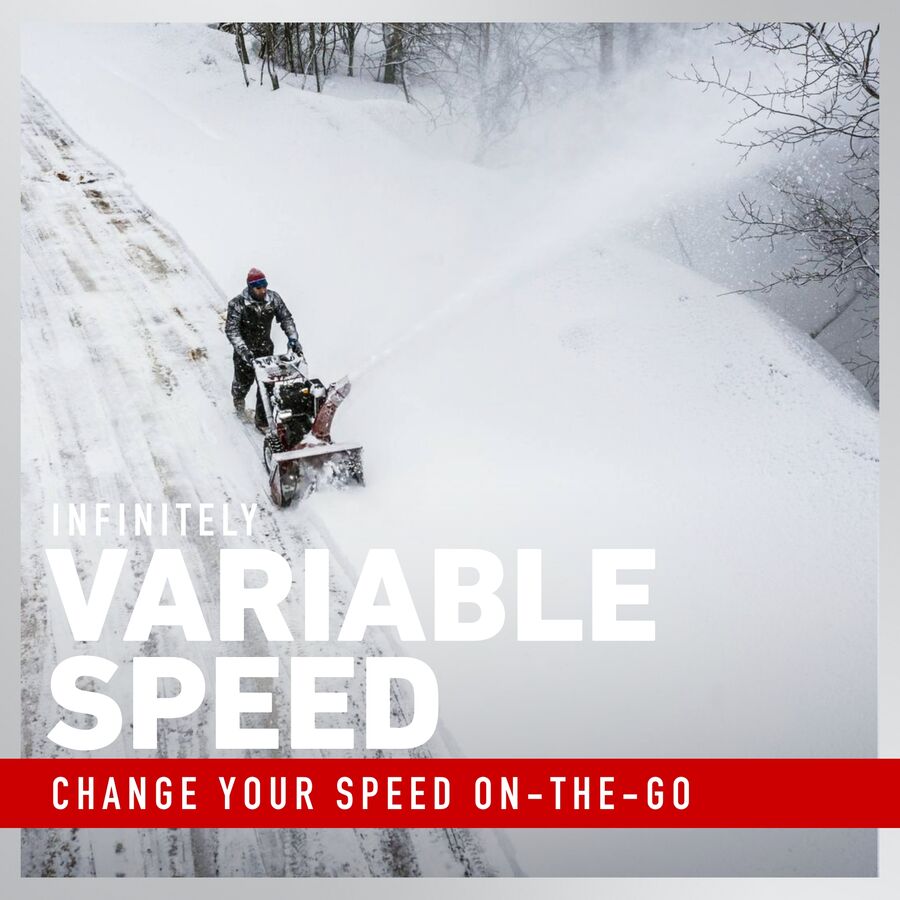 Equipped with one-push electric start, power steering, commercial-duty handle, LED headlight, hand warmers, anti-clogging system, cast-iron skids with drift-cutters, Hardened Gears™ and commercial-grade no-shear pins gearbox. Our hydrostatic transmission adjusts speed on the fly with one-handed operation. Power up, power down with infinitely variable speed control.